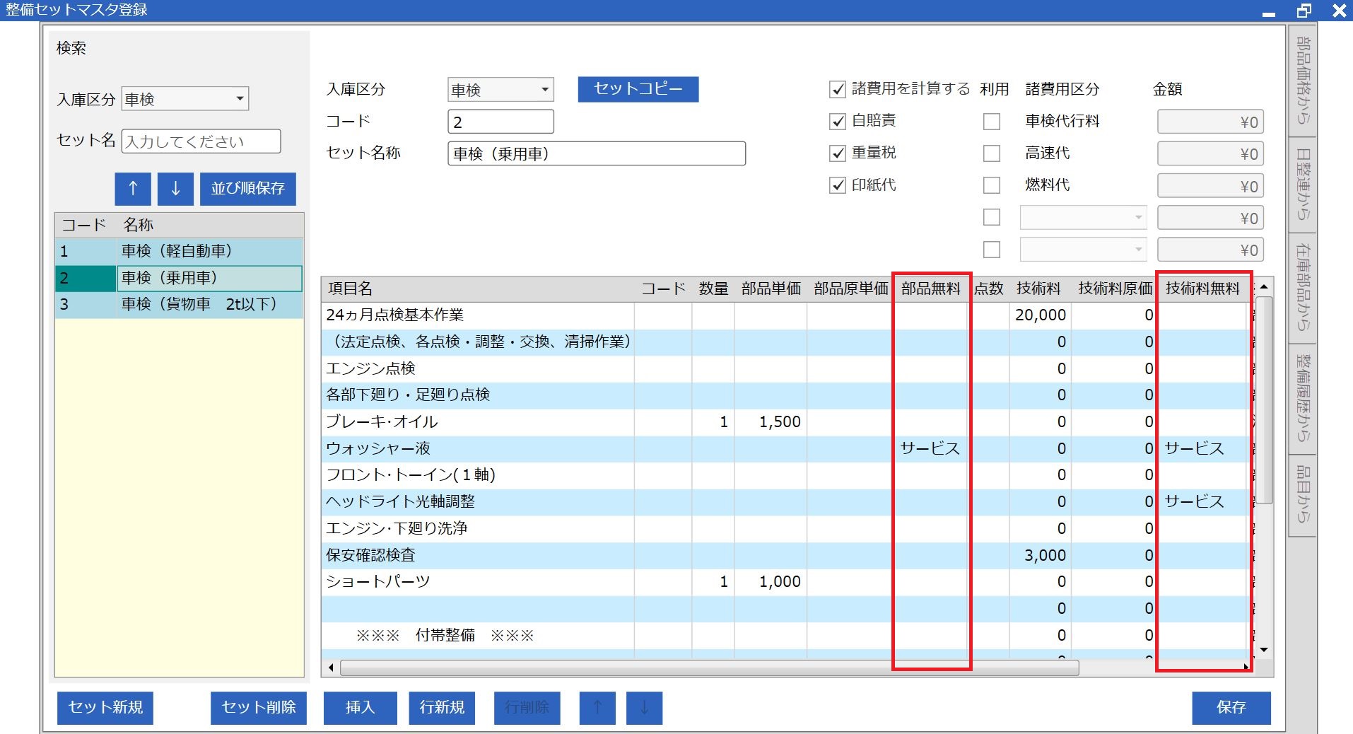 整備セットの明細に「部品無料」「技術料無料」を設定できるように機能を拡張しました。